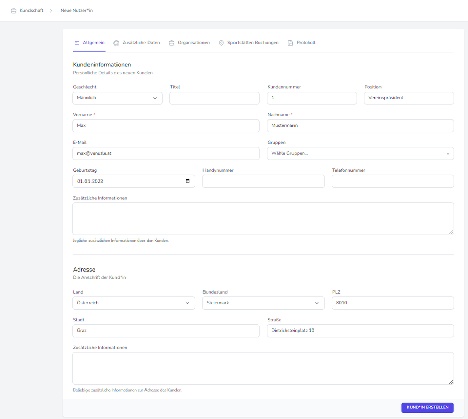 Danach können Sie alle relevanten Daten eingeben. Beim Erstellen neuer Nutzer*innen ist dabei zumindest der Vor- und Nachname einzutragen. Pflichtfelder erkennen Sie am roten Stern neben der Bezeichnung. Zum Abschließen klicken Sie auf "Kund*in erstellen"
