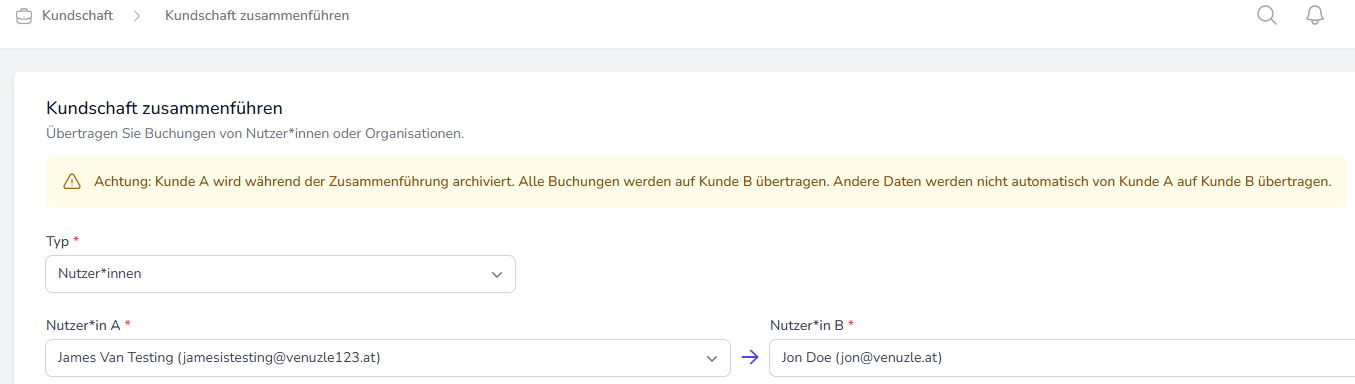 Bei der Zusammenführen werden nur die Buchungen des Nutzenden bzw. der Organisation auf die andere übertragen. Andere Daten, wie beispielsweise Adressdaten, werden nicht übertragen. Die Übertragung erfolgt von Nutzer*in A auf Nutzer*in B.
