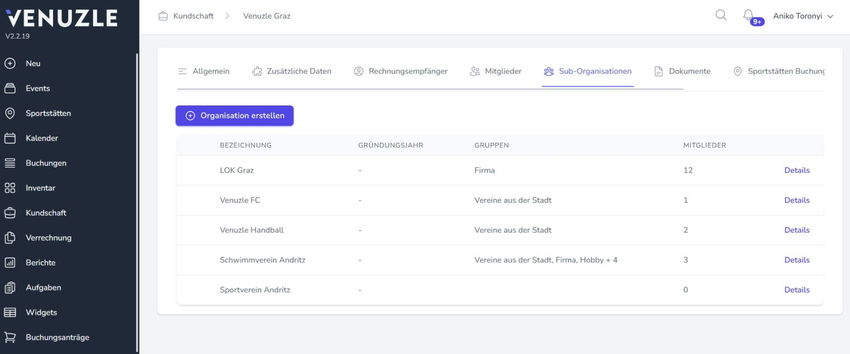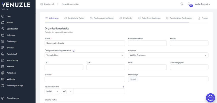 Öffnen Sie im Venuzle Manager im Menü den Bereich Kundschaft und wählen Sie Neue Organisation erstellen.