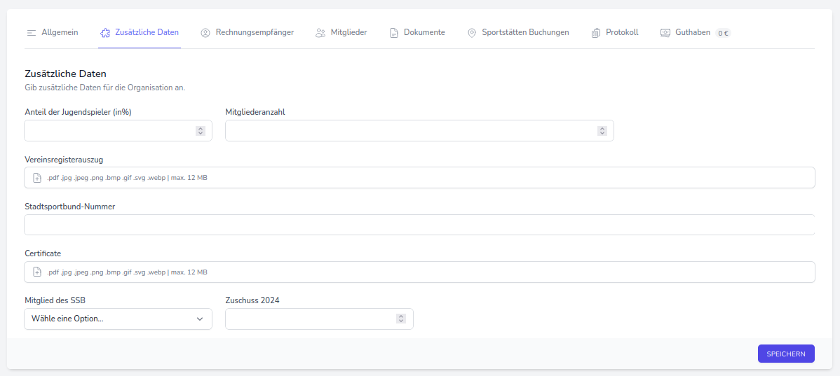 In einer Organsiation können hier beispielsweise die Mitgliederanzahl gespeichert oder relevante Dokumente (z.B. Vereinsregisterauszug) hochgeladen werden.