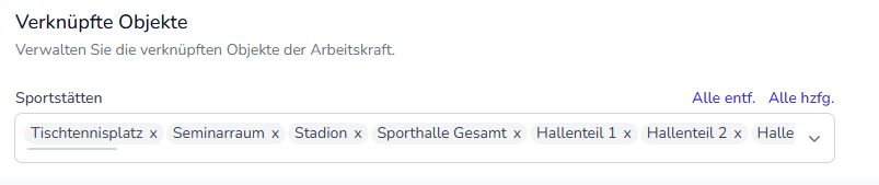 Im Sportstättenfeld können alle oder einzelne Sportstätten, für welche die Benachrichtigung gilt, abgewählt oder hinzugefügt werden. Allerdings werden hier nur Sportstätten angezeigt, die mit der Person verknüpft sind. Die Verknüpfung kann in den Kontoeinstellungen im Bereich "Allgemein" vorgenommen werden.