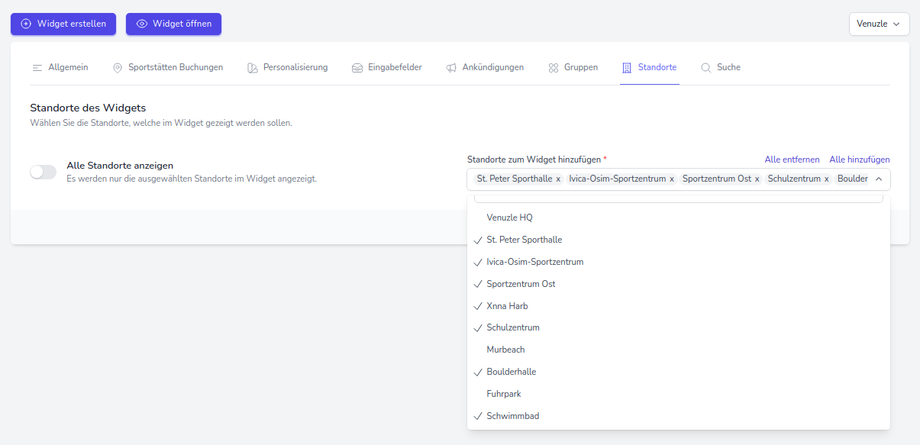 Im Venuzle Mangager können Sie Einstellungen für die Standortübersicht und Suchfilter im Widget vornehmen.