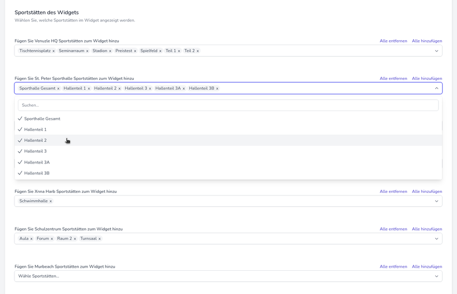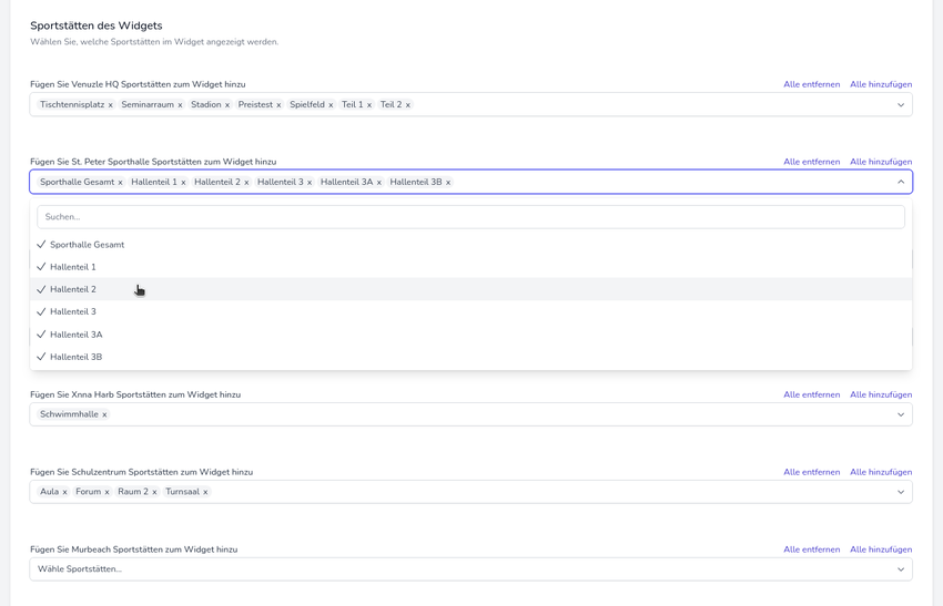 Anschließend können Sie festlegen, welche Sportstätten der einzelnen Standorte im Widget angezeigt werden sollen. Wählen Sie dazu über das Dropdown Menü einfach jene Sportstätten aus, die Sie hinzufügen möchten. Vergessen Sie nicht, diese Einstellungen nach dem Erstellen einer neuen Sportstätte zu aktualisieren.