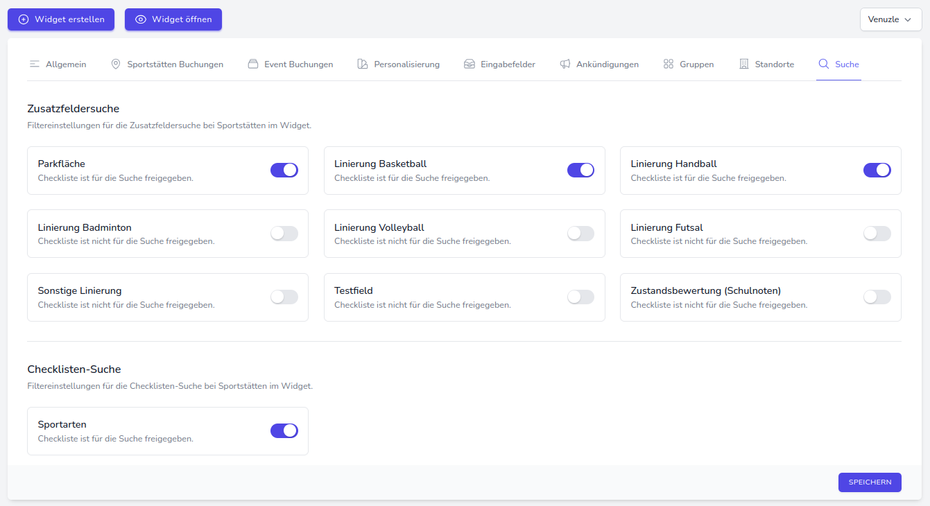 Die Filtereinstellungen für die Sportstättensuche können im Reiter Suche vorgenommen werden. Hier haben Sie die Möglichkeit unterschiedliche Filterkriterien für die Suche freizugeben oder zu sperren. Vergessen Sie nicht, Ihre Änderungen zu speichern, damit diese übernommen werden.