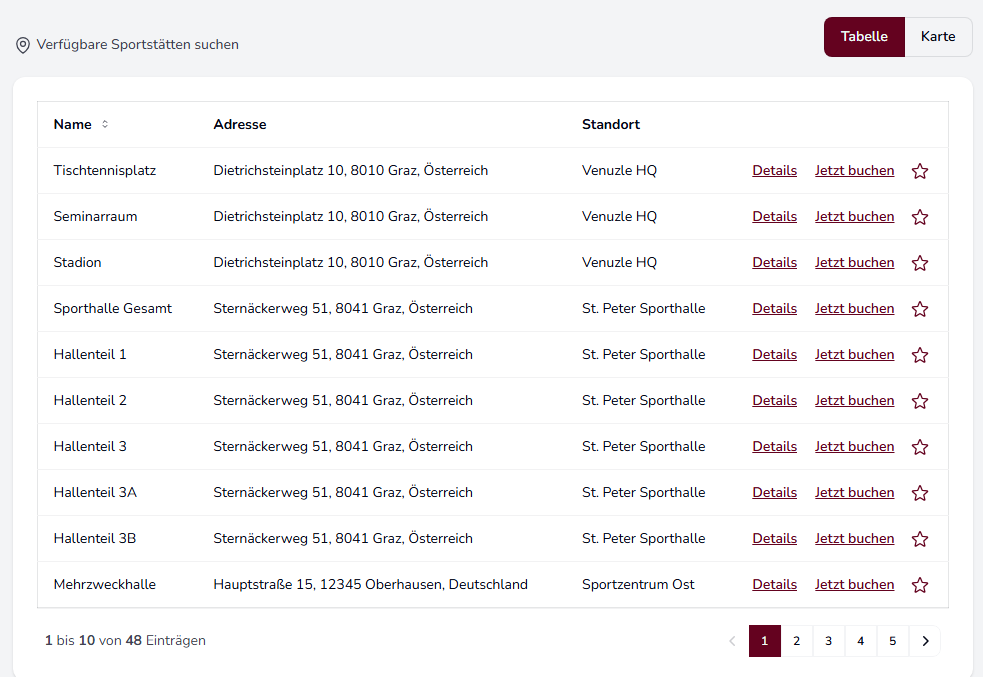 Bei den Sportstätten kann zwischen einer Tabellenansicht und Kartenansicht entschieden werden.