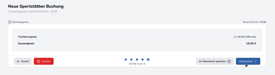 Wenn man die Sportstätten nach Buchungstyp filtert und hier bereits einen Zeitraum angibt, wird dieser automatisch übernommen, wenn der Buchungsprozess startet.