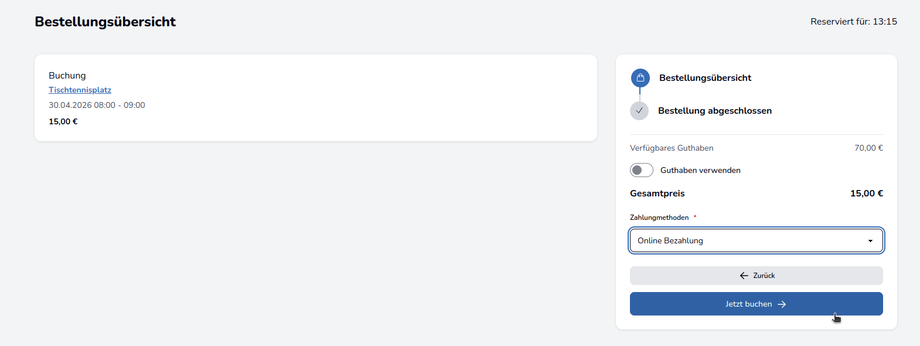 In der Bestellungsübersicht werden alle Buchungen sowie der Gesamtpreis aufgelistet. Hier muss nun noch die bevorzugte Zahlungsmethode ausgewählt werden. Falls die Guthaben-Funktion aktiv ist, kann in diesem Schritt ein verfügbares Guthaben ausgewählt werden. Mit einem Klick auf “Jetzt buchen” ist die Bestellung abgeschlossen.