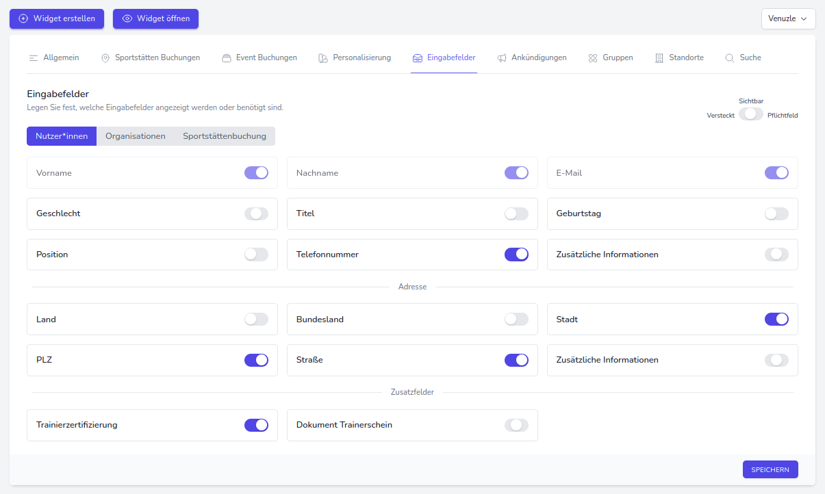 Im Venuzle Manager können unter "Einstellungen" > "Widgets" im Reiter Eingabefelder alle Felder für die Registrierung und die weitere Nutzung im Widget definiert werden.