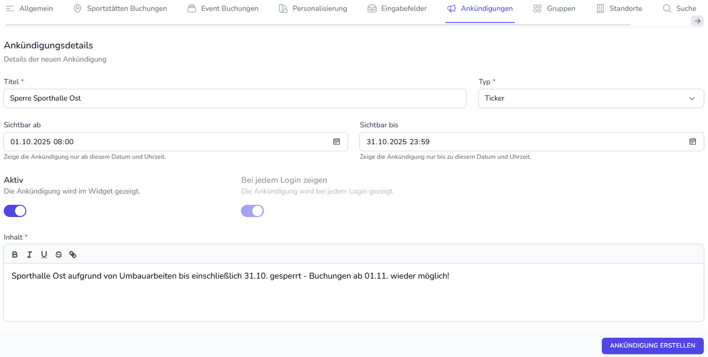 Bei Klick auf "Ankündigung erstellen" öffnet sich ein neues Fenster, in dem Sie die Details der Ankündigung festlegen können.