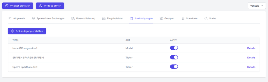 Bei Bedarf können im Widget Ankündigungen gezeigt werden, welche entweder nach dem Login als Pop-Up Fenster oder im oberen Bildschirmbereich als Ticker aufscheinen.