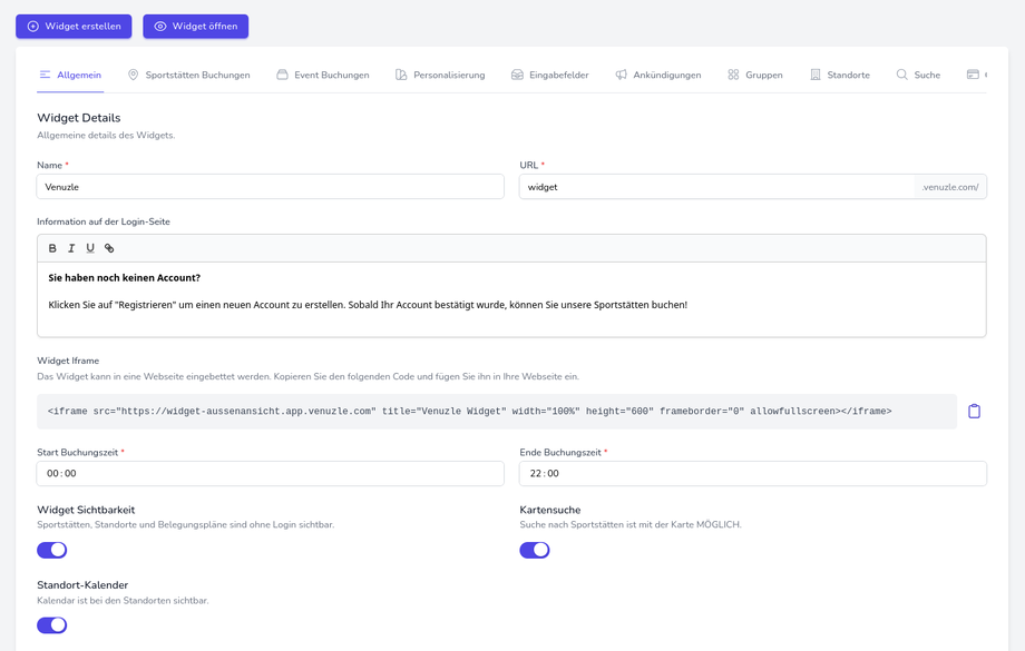 Im Venuzle Manager können Sie im Menü unter "Einstellungen" > "Widgets" neue Widgets erstellen oder bestehende Widgets anpassen. Auf der Startseite werden Ihre bestehenden Widgets angezeigt und Sie haben hier die Möglichkeit diese zu bearbeiten. Sollten Sie mehrere Widgets erstellt haben, können Sie in der rechten oberen Bildschirmecke ein bestimmtes Widget auswählen.