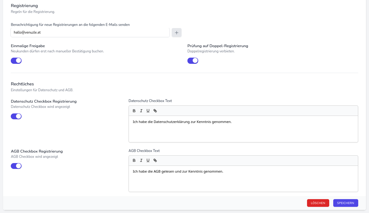 Sie können zudem festlegen, ob neue Accounts vor der ersten Buchung erst im Venuzle Manager bestätigt werden müssen und ob eine Doppelregistrierung von E-Mail Adressen möglich ist.