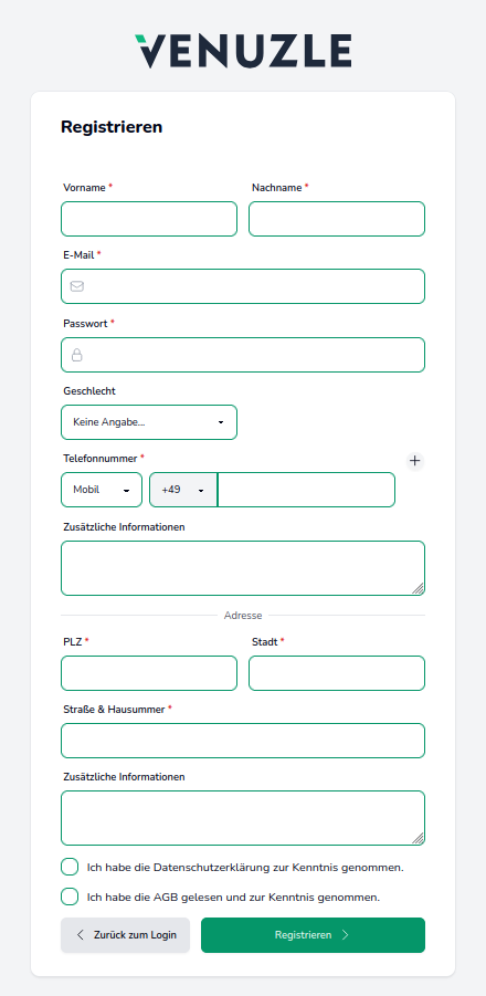 In der Registrierungsmaske werden zuerst alle Standard Daten abgefragt. Alle zusätzlichen Daten können nach der erstmaligen Registrierung ergänzt werden. Über die Widget-Einstellungen im Venuzle Manager können Sie vorab die Eingabefelder für das Widget definieren.