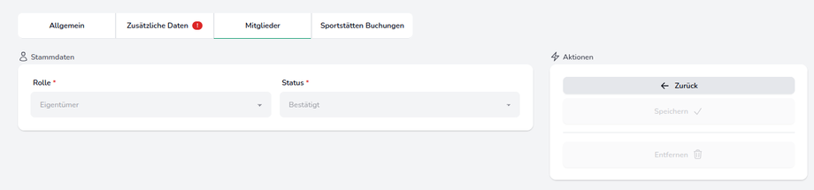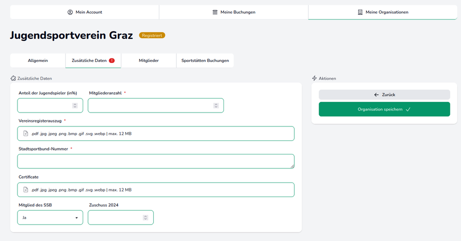 Dieser Bereich enthält zusätzliche organisationsbezogene Daten, wie z.B. die Mitgliederanzahl oder den Vereinsregisterauszug.