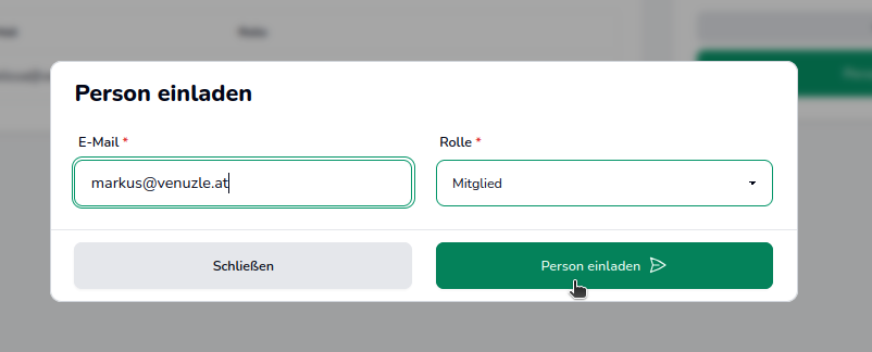 Um eine Person zur Organsiation einzuladen klickt man auf "Person einladen" und gibt nun die E-Mail Adresse der Person ein. Außerdem wird hier auch gleich die zukünftige Rolle der Person ausgewählt: