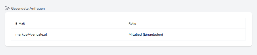 Sobald auf "Person einladen" geklickt wurde, erscheint die gesendete Anfrage in der Mitglieder-Übersicht der Organsiation. Hier ist auch der Status der Einladung ersichtlich. Die Einladung kann anschließend im Manager bestätigt werden.