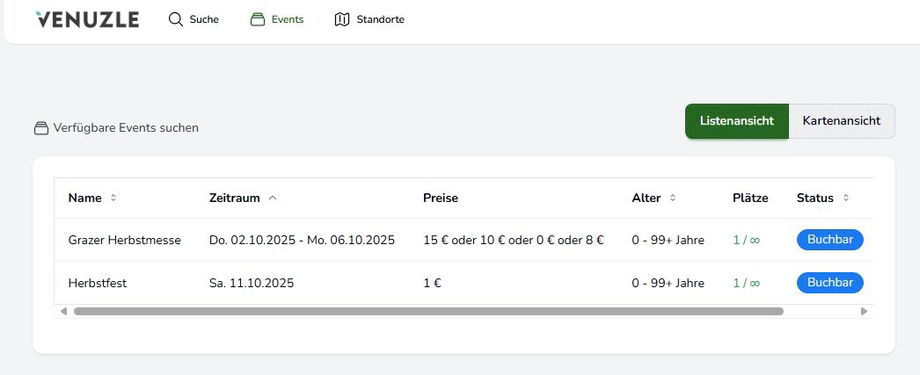 Ist das Buchen von Events über das Widget aktiviert, erhalten Nutzer*innen unter dem Reiter Events einen Überblick über alle buchbaren Events. Auch hier kann zwischen Karten- und Listenansicht gewechselt sowie Filter angewendet werden.