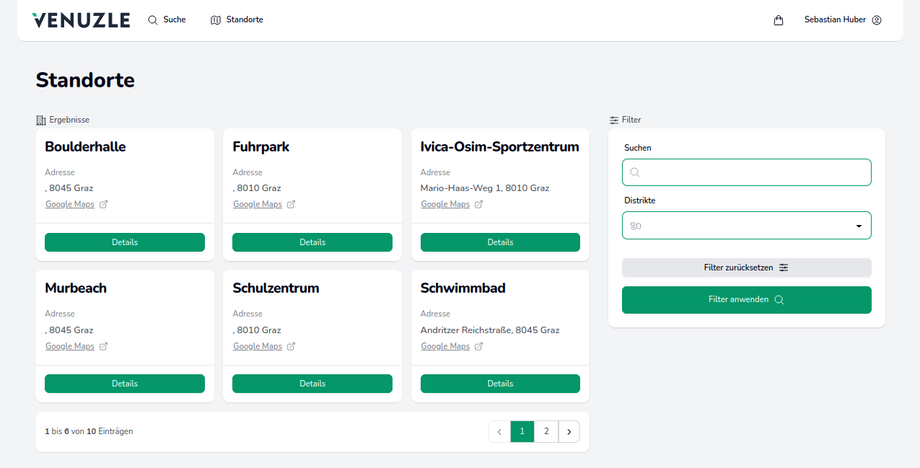Unter dem Reiter Standorte in der Menüleiste werden alle verfügbaren Sportstätten und Standorte aufgelistet.