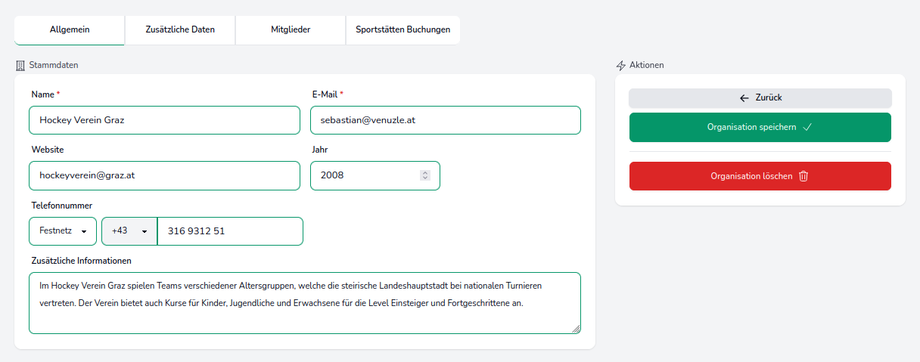 Wenn man nun unter Meine Organisationen eine Organisation auswählt, hat man die Möglichkeit allgemeine und zusätzliche Daten, Mitglieder der Organisation sowie verknüpfte Sportstätten Buchungen einzusehen bzw. zu bearbeiten. Etwaige Änderungen können im Aktionsfeld im rechten Bildschirmbereich gespeichert werden.