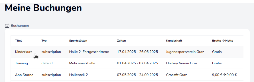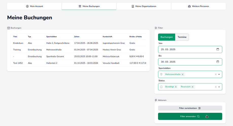 Nachdem der Account bestätigt und Buchungen getätigt wurden, sind diese im Reiter Meine Buchungen ersichtlich.