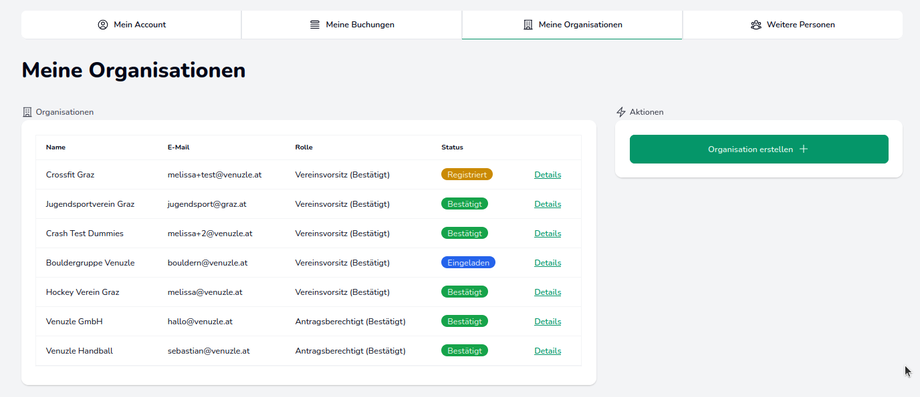 Hier werden alle verknüpften Organisationen, Vereine, Firmen etc. angezeigt, welchen man als Nutzer*in zugeordnet ist.