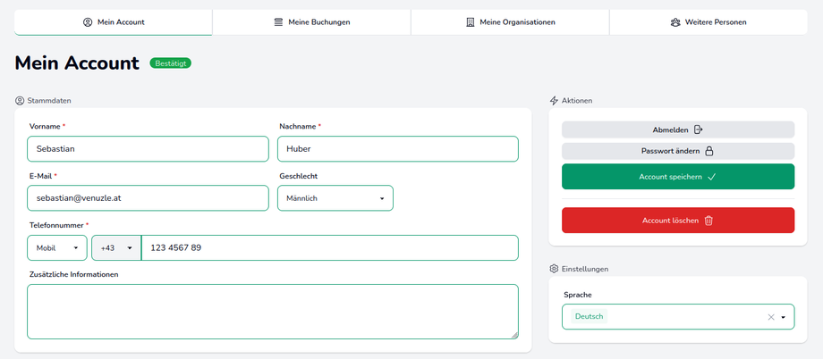 Per Klick auf den Benutzernamen in der rechten oberen Bildschirmecke gelangt man zum persönlichen Account, den getätigten Buchungen, den verknüpften Organisationen und kann Weitere Personen verwalten. Außerdem kann man sich vom Account abmelden.