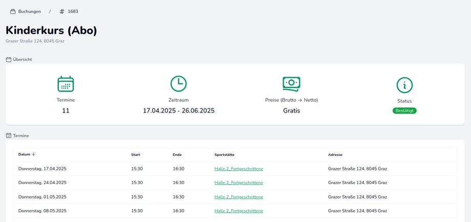 Es öffnet sich eine Buchungsübersicht, die neben den Buchungs-Details (Terminanzahl, Zeitraum, Preis, Status) alle in der Buchung enthaltenen Termine auflistet.